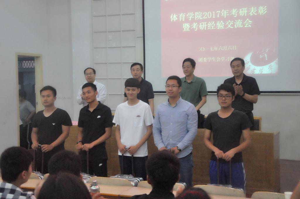 6月6日晚,体育学院在和展楼阶梯102教室举行2017年考研表彰暨经验交流会,体育学院领导石展望、刘安民、李驰、田玉,教学秘书张玉宝,分团委书记、2014级辅导员陈汇文,2017届毕业生辅导员刘美丽等出席会议,2017届优秀毕业生代表,2014级全体学生,2015、2016级学生代表参加了会议。会议由李驰副书记主持。