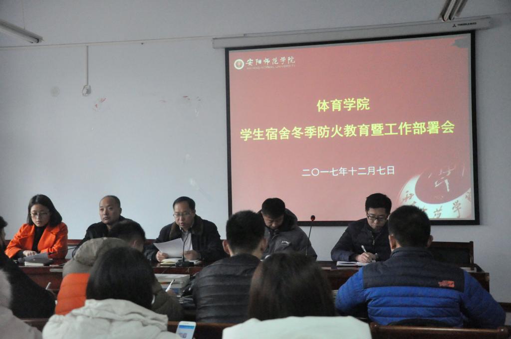 12月7日中午,体育学院在和境楼大会议室召开生学生宿舍冬季防火教育暨工作部署会,党委副书记李驰,学工办主任赵峥,团委书记陈汇文,各年级辅导员出席会议,学生会主席团成员、各年级长、班长参加会议。