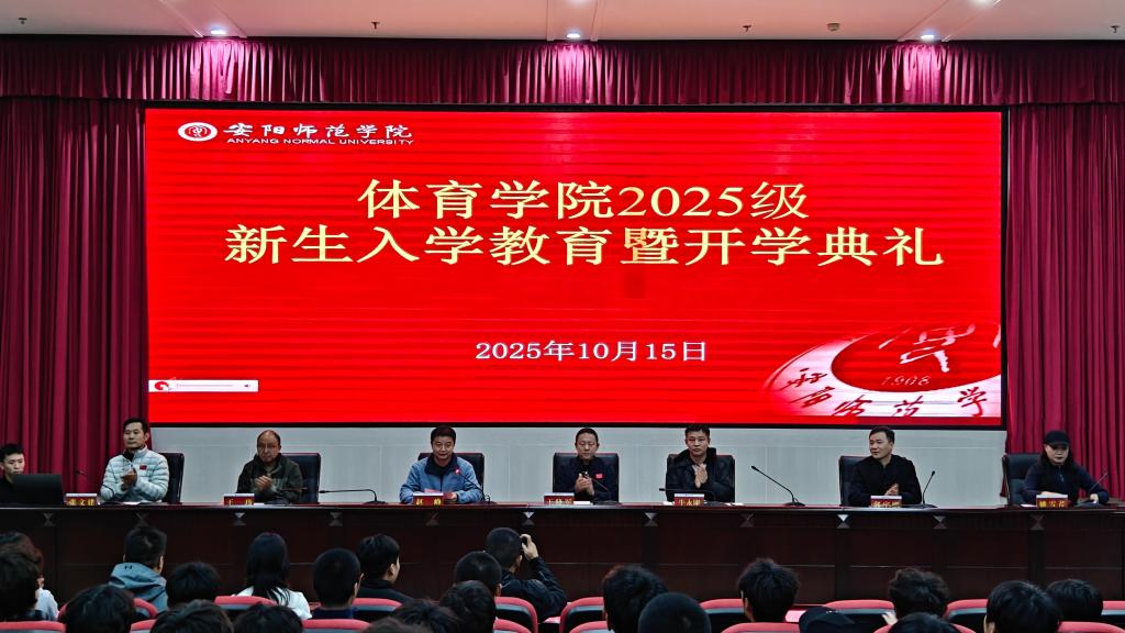 2025年10月15日下午,体育学院于文博楼二楼报告厅隆重举行2025级新生入学教育暨开学典礼。学院党委书记王晓军、院长牛永刚、党委副书记赵峥、副院长郭宇刚、王玮、姚雪芹、校体委办公室副主任张文建,以及学院教师代表、全体辅导员、2023级学生代表、2025级全体新生共同出席,会议由党委副书记赵峥主持。