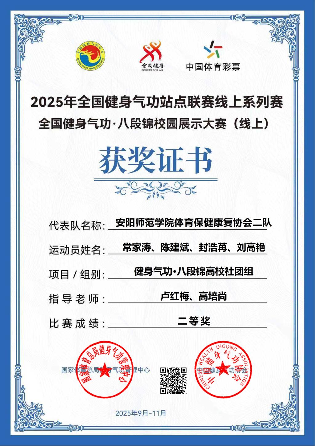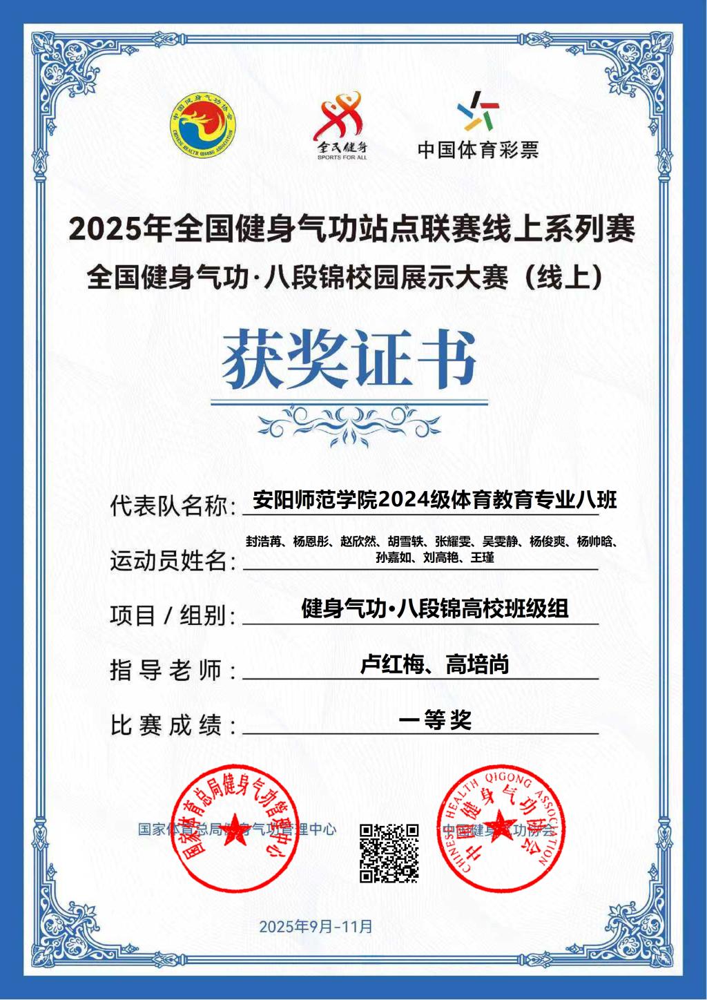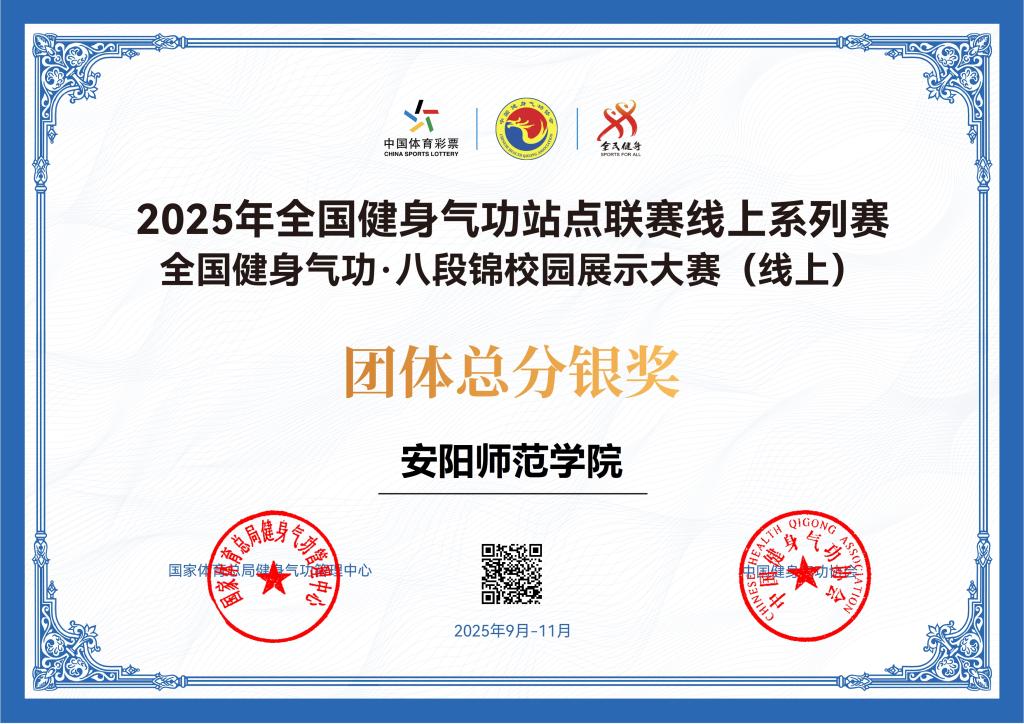 近日,由国家体育总局健身气功管理中心主办的2025 年全国健身气功·八段锦校园展示大赛落下帷幕。我院精心组织的五支参赛队伍在比赛中表现出色,共斩获三个一等奖、两个二等奖,以优异成绩荣获团体总分银奖,充分展现了学院在传统体育教育领域的深厚底蕴与学子的蓬勃风采。