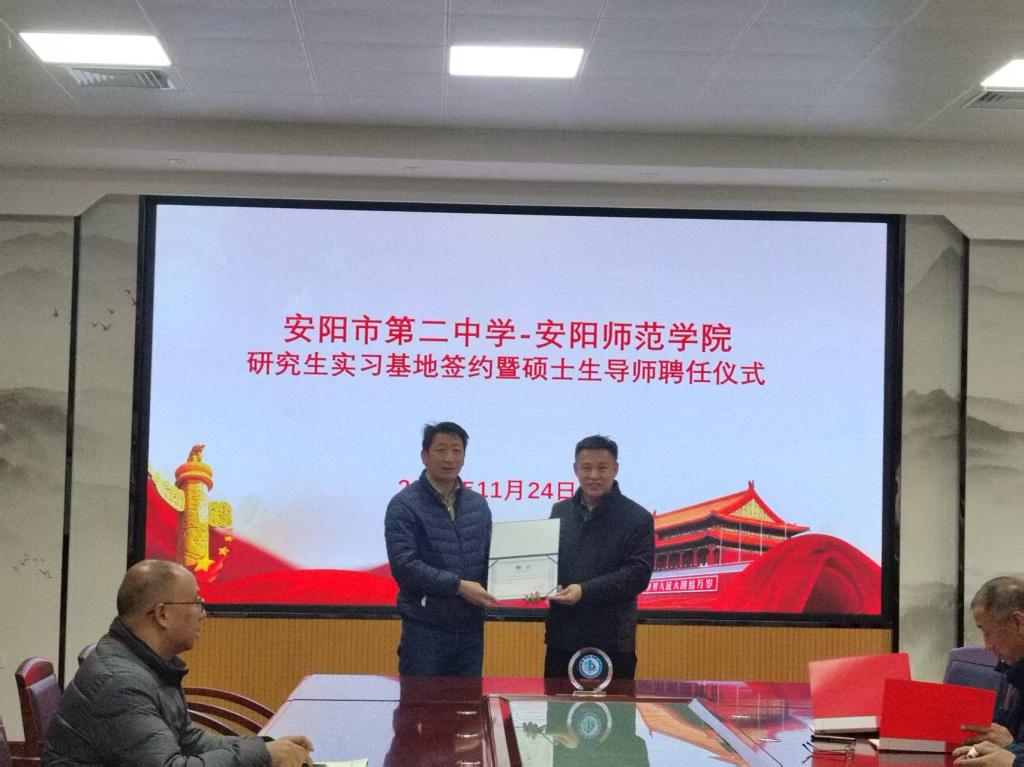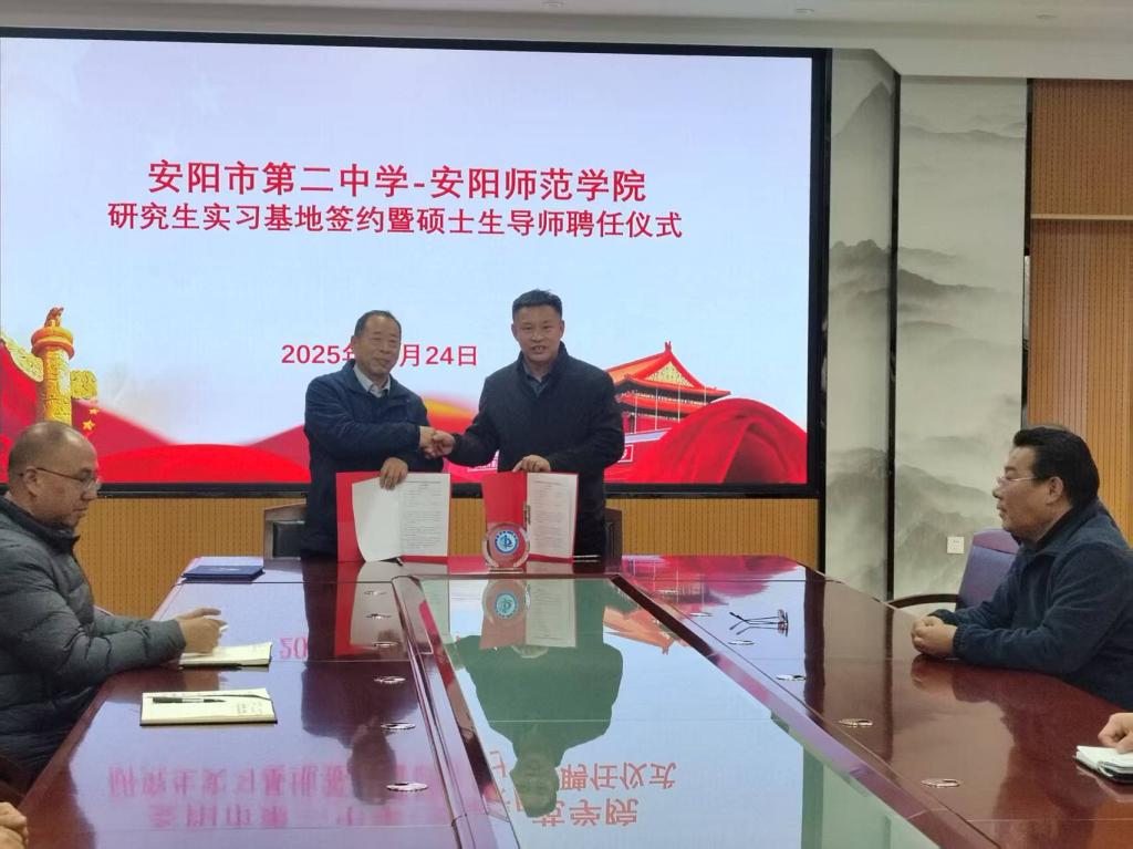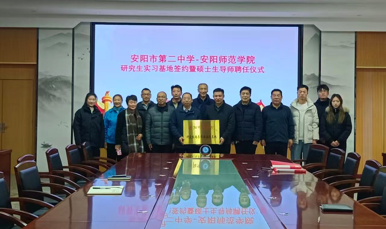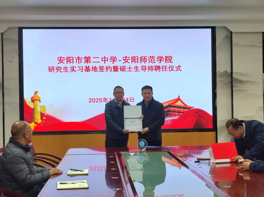 2025年11月24日,安阳市第二中学与安阳师范学院研究生实习基地签约暨硕士生导师聘任仪式在安阳市第二中学隆重举行。安阳师范学院体育学院院长牛永刚一行3人、安阳市第二中学书记曹保平等校领导出席仪式,安阳市第二中学体育组教师及安阳师范学院体育学院实习生参加仪式,仪式由安阳市第二中学侯振明主任主持。
